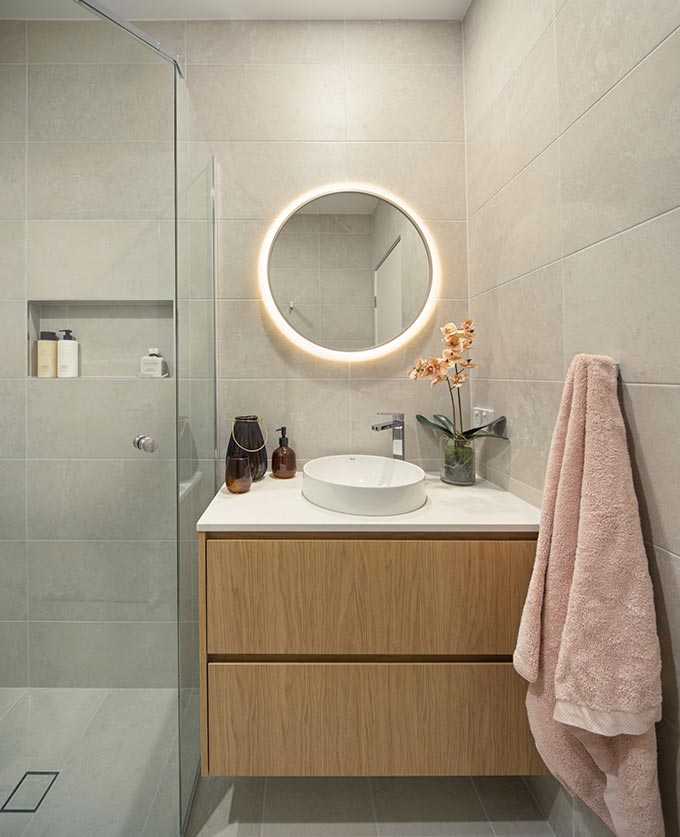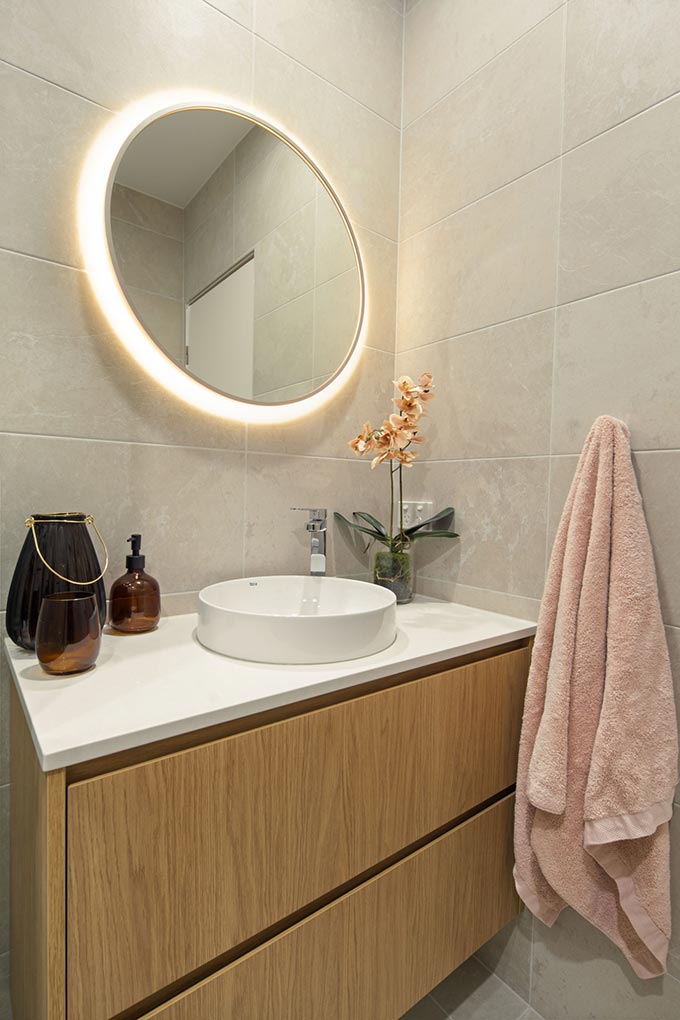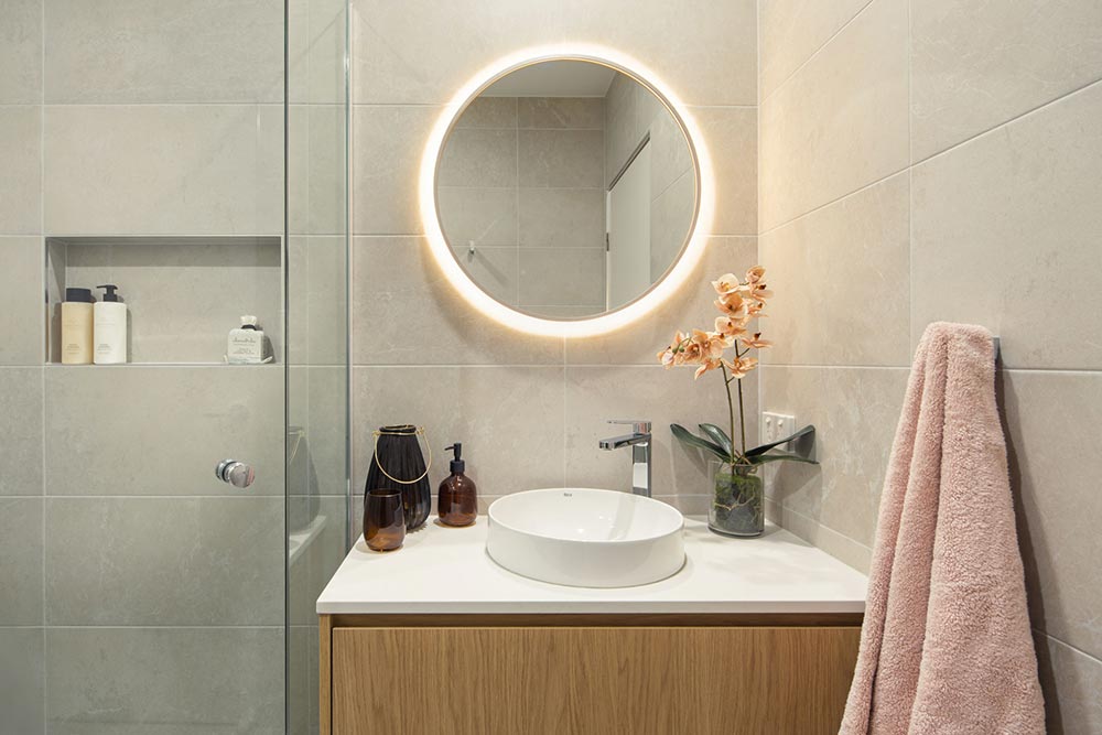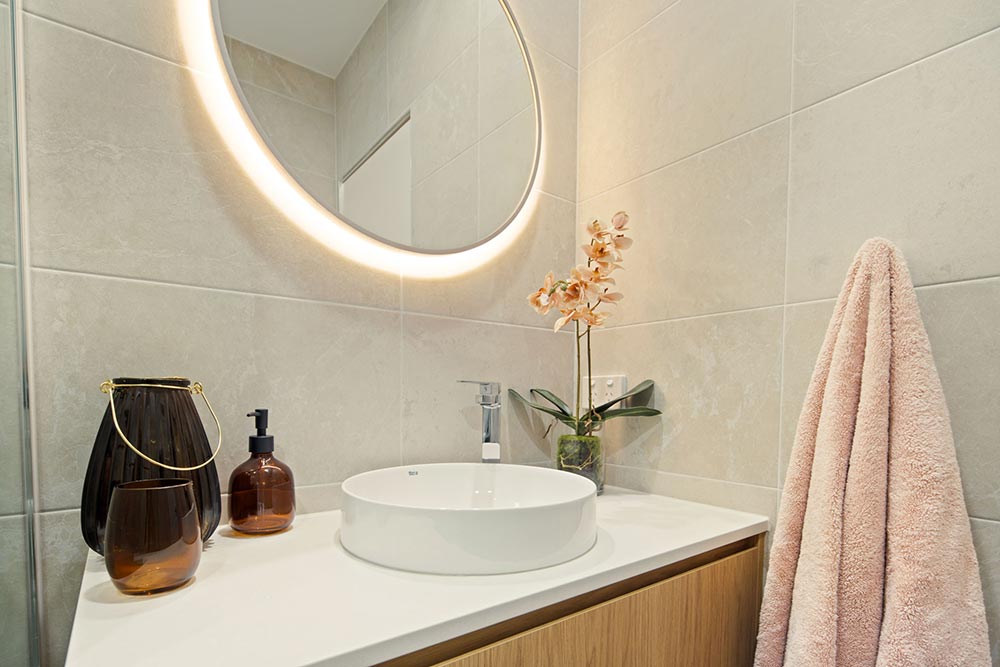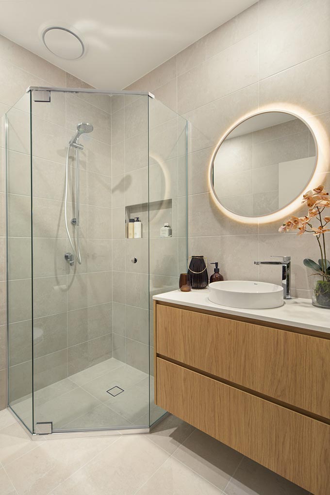 Beyond the kitchen, the material palette continues into the bathroom and laundry. Natural timber cabinetry pairs with the same striking stone benchtops, creating continuity throughout the home. Brushed brass tapware, soft neutral tiling and an illuminated arched mirror add warmth and subtle luxury, while clever integration of laundry appliances ensures efficient use of space.