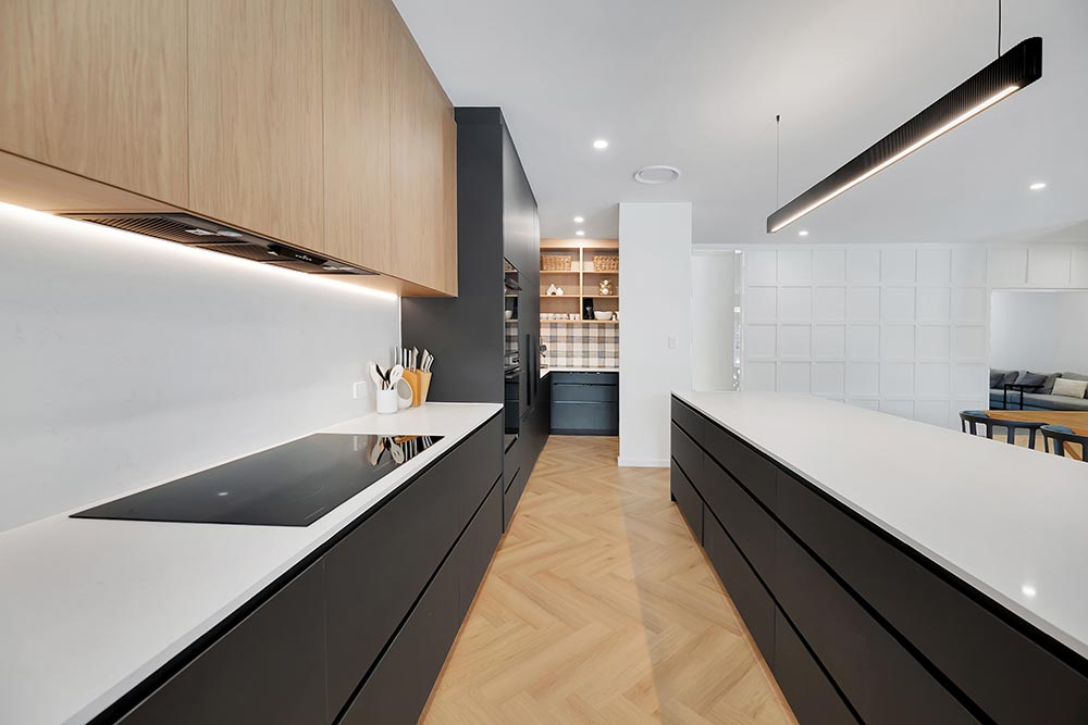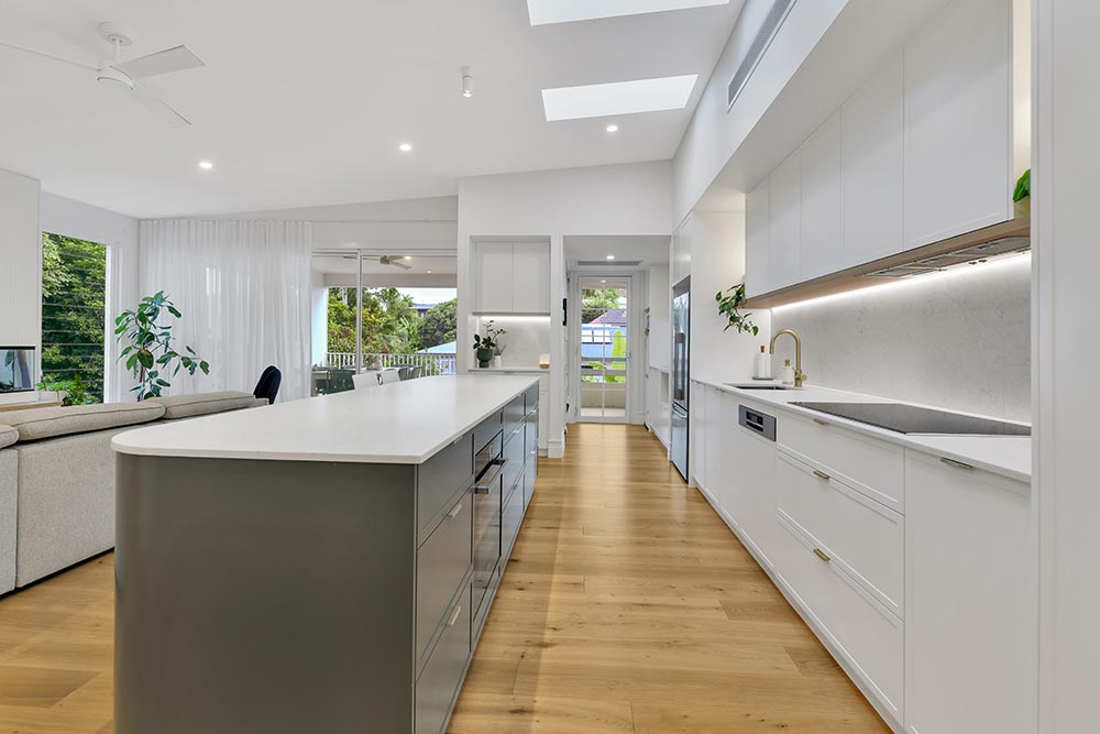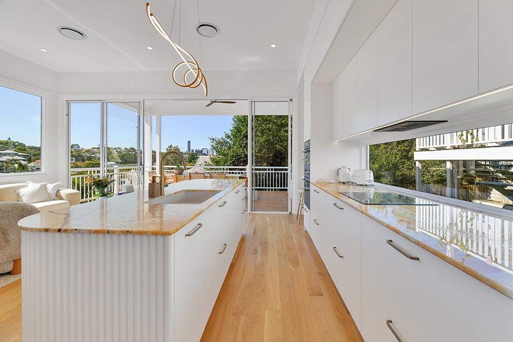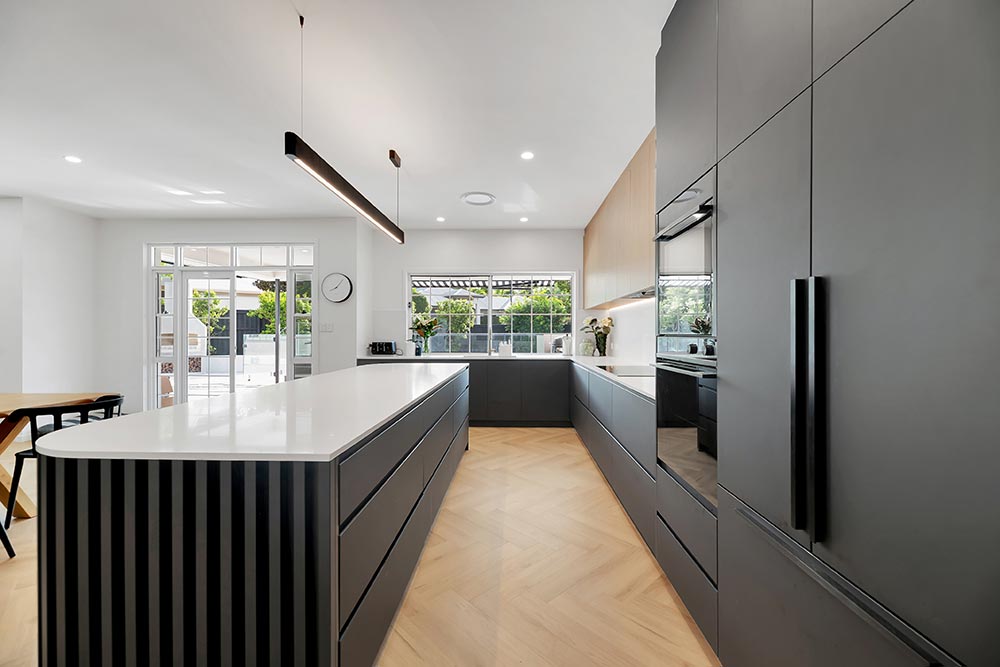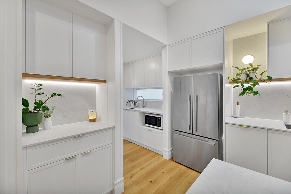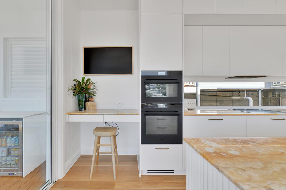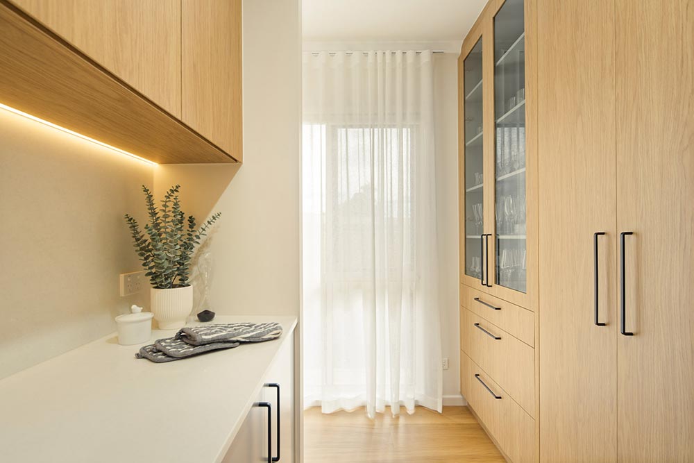 Full-height, handle-detailed cabinetry lines the walls, concealing appliances and delivering generous storage while maintaining a seamless aesthetic. A horizontal window splashback draws in natural light and frames the outdoor outlook, reinforcing the home’s open, airy atmosphere. Integrated appliances and a built-in desk nook further enhance functionality without disrupting the clean design language.