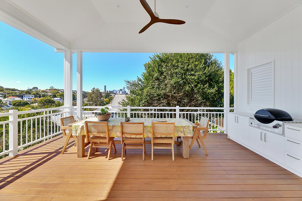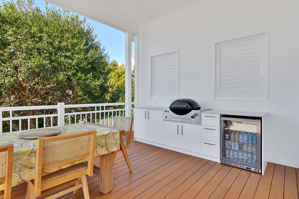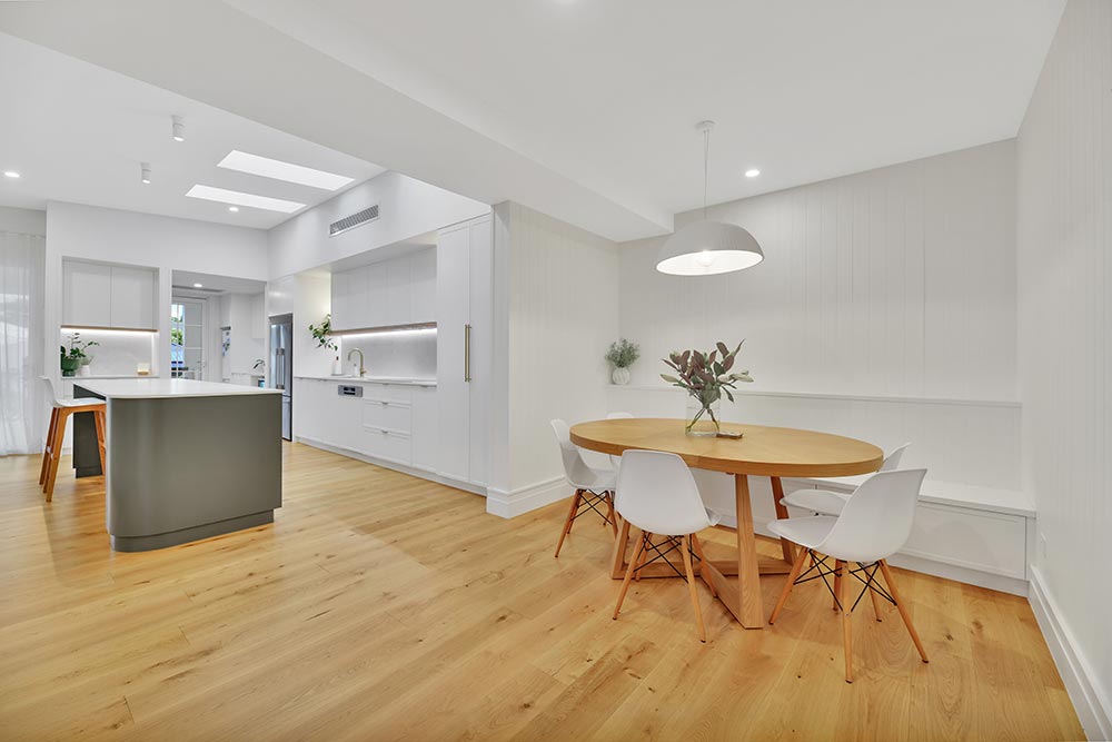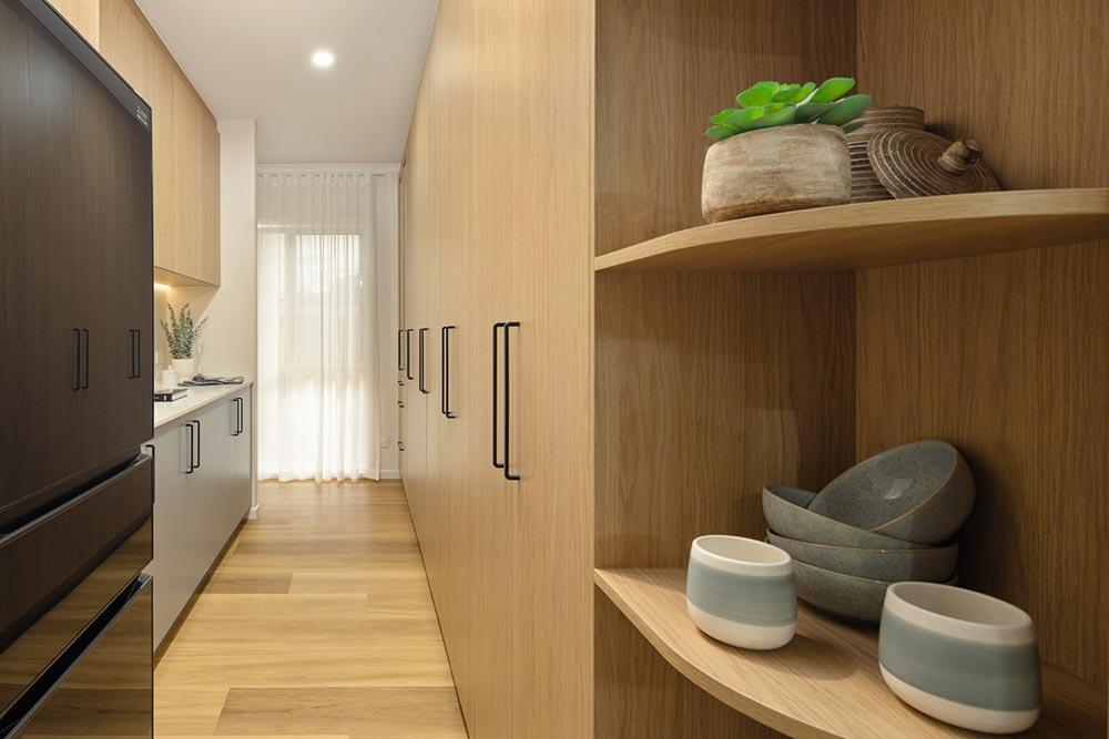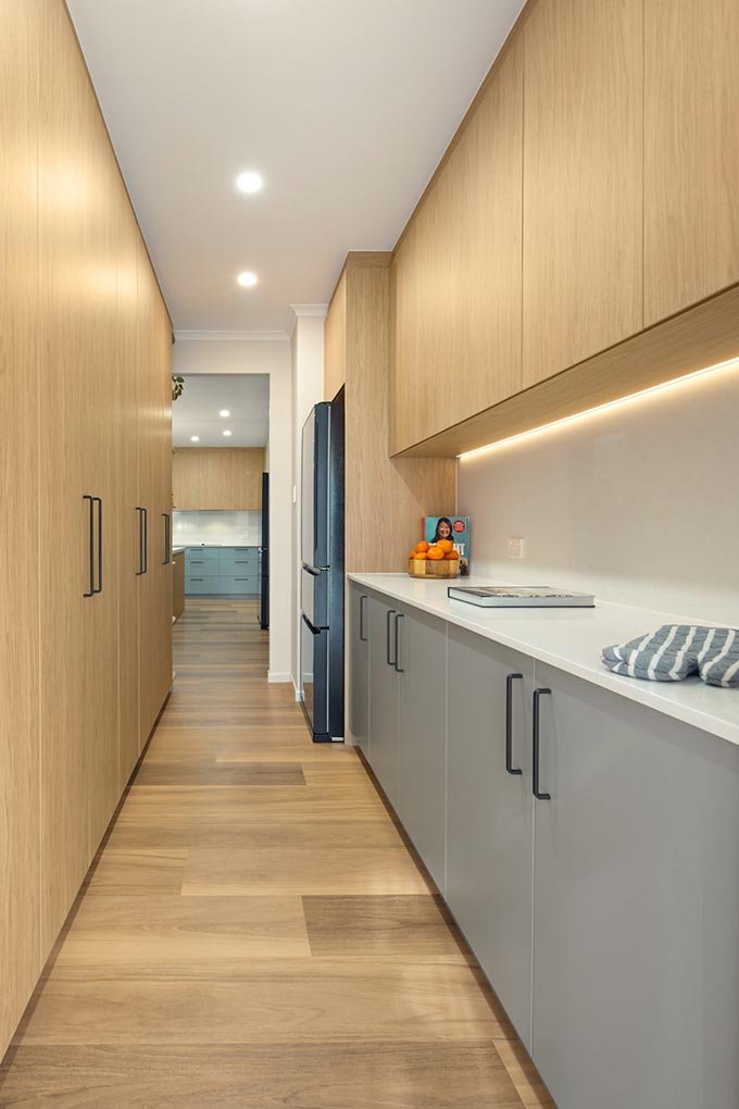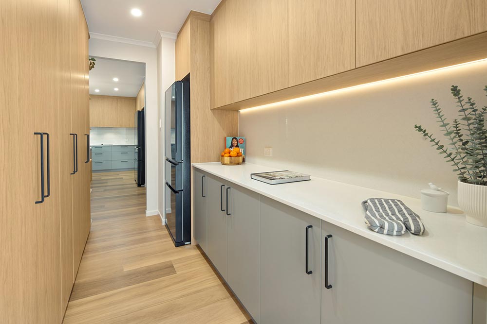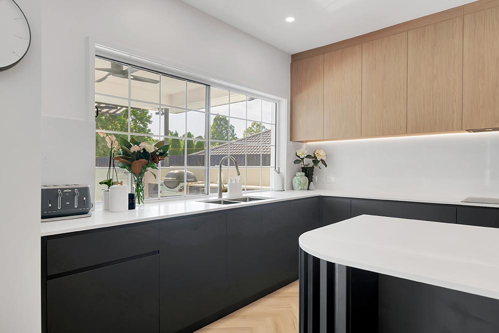 Full-height, handle-detailed cabinetry lines the walls, concealing appliances and delivering generous storage while maintaining a seamless aesthetic. A horizontal window splashback draws in natural light and frames the outdoor outlook, reinforcing the home’s open, airy atmosphere. Integrated appliances and a built-in desk nook further enhance functionality without disrupting the clean design language.