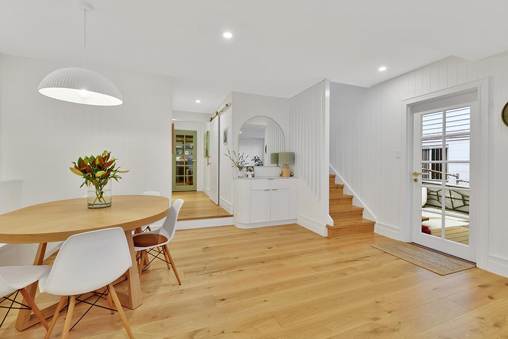 In the bathroom, a floating timber vanity paired with a crisp white stone top and vessel basins creates a refined, spa-like atmosphere. Wall-mounted tapware and mirrored cabinetry enhance both functionality and visual clarity. The adjoining laundry maintains the same material palette, incorporating compact yet highly efficient joinery solutions that maximise storage within a small footprint.