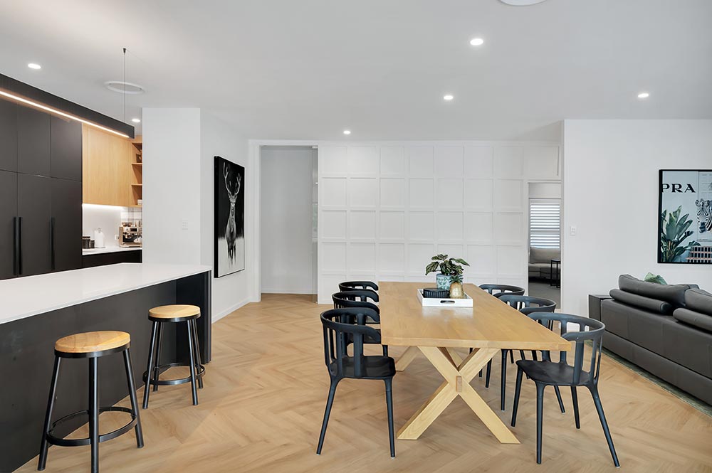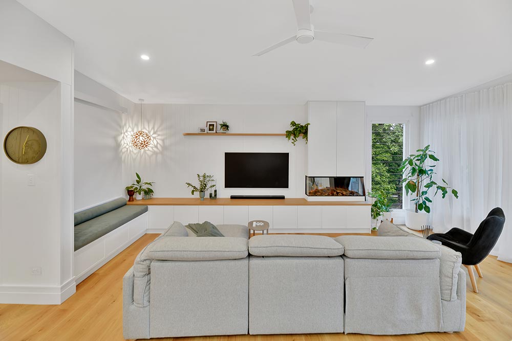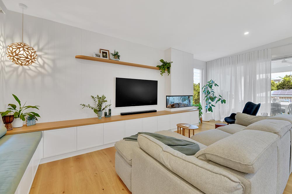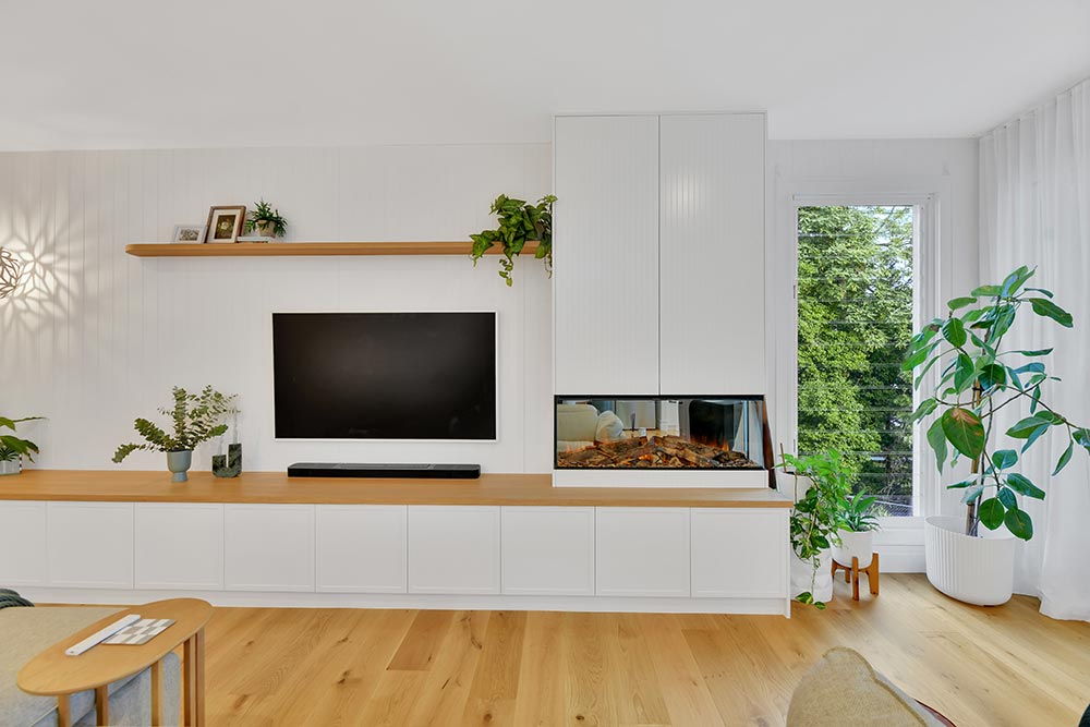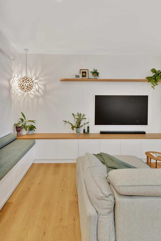 The living area continues the material language with a custom timber feature wall and integrated low-line cabinetry. Floating elements reinforce the sense of space, while concealed storage ensures practicality within a streamlined design. The result is a seamless transition between kitchen and living zones, unified by consistent finishes and thoughtful proportions.