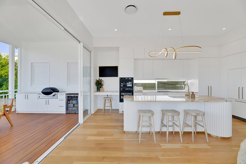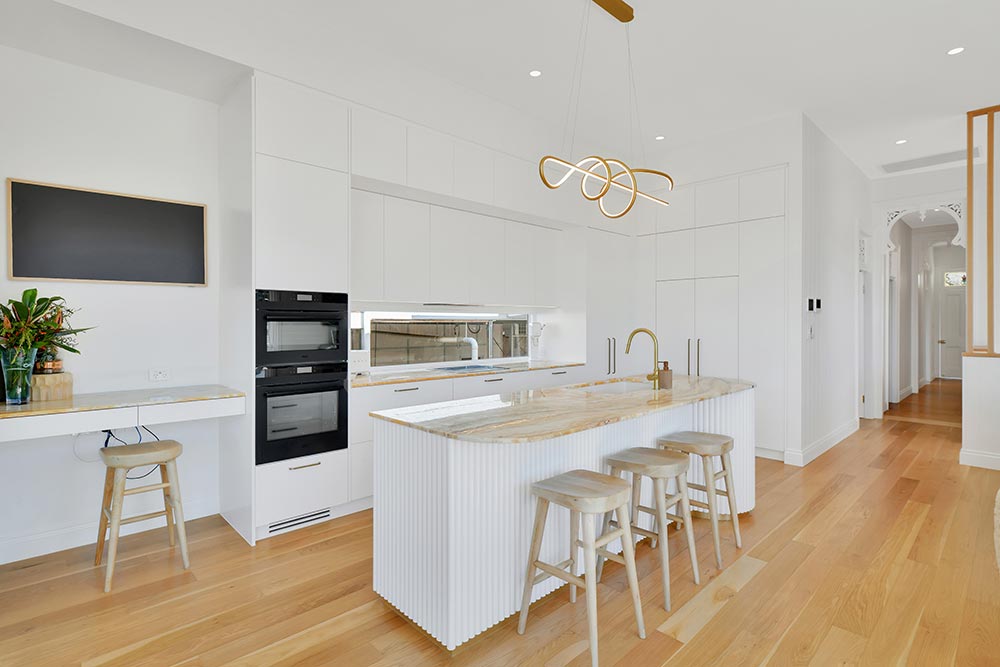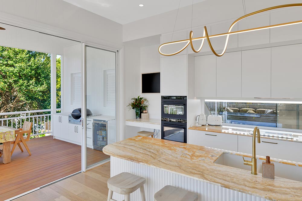 At the heart of the home, the kitchen makes a bold yet elegant statement. A sculptural island featuring vertical fluted panelling anchors the space, topped with richly veined golden stone that introduces warmth and organic movement. The curved edges of the island soften the overall form, enhancing flow and encouraging gathering. Brushed brass fixtures and a custom statement pendant provide a refined contrast against the minimalist white cabinetry.
