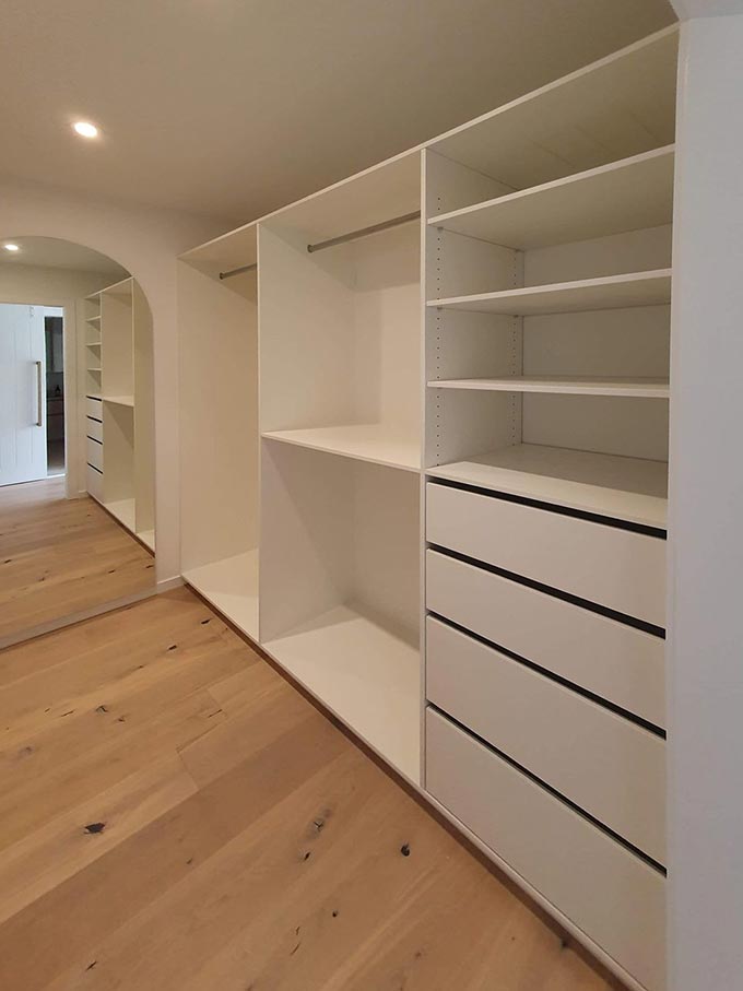 Choosing the right wardrobe design involves considering your bedroom size, storage needs, and personal style. Tailored Interiors offers a consultation to help assess your space and preferences, suggesting designs that maximise storage while complementing the room’s aesthetics. Options range from built-in wardrobes for smaller rooms to walk-in robes for more extensive collections. Book a consultation with our wardrobe cabinet maker to find the perfect design for your home!